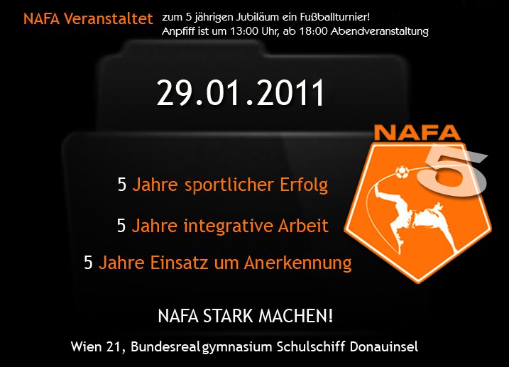 Der Fußballverein NAFA feiert sein 5-jähriges Jubiläum. Nach dem Benefiz-Clubbing Ende Dezember findet als zweiter feierlicher Event ein Jubiläumsturnier am 29. Jänner 2011 ab 13 Uhr im Bundesrealgymnasium Schulschiff Donauinsel im 21. Bezirk statt. Bei der anschließenden Abendveranstaltung werden ab 18 Uhr Ehrengäste aus Politik und Sport erwartet. Das NAFA-Jubiläumsturnier wird vom FairPlay-Projektpool gefördert.