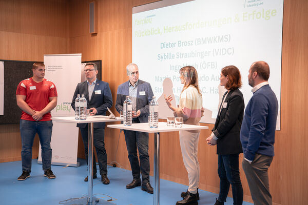 Im Eröffnungspanel mit Sybille Straubinger (VIDC), Ingo Mach (ÖFB), Martin Poiger (Judo Austria), Stephan Hegyi (S.C. Hakoah) und Dieter Brosz (BMWKMS) wurden die unterschiedlichen Herangehensweisen an die Präventionsarbeit in den jeweiligen Bereichen thematisiert. Deutlich wurde die hohe Relevanz der Arbeit in den Sportstrukturen, um auch zukünftig einen inklusiven Raum ohne Ausgrenzung, Hass und Extremismus gewährleisten zu können.