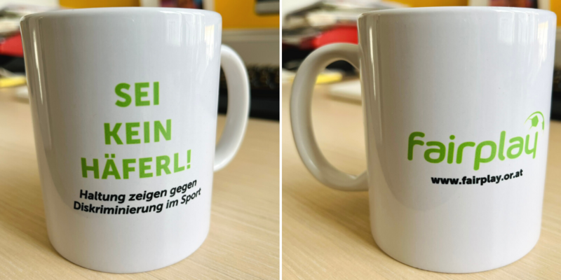 Es ist da! Zum ersten mal haben wir ein eigenes fairplay Häferl. Der Aufdruck ist simpel und eindeutig: SEI KEIN HÄFERL - Haltung zeigen gegen Diskriminierung im Sport