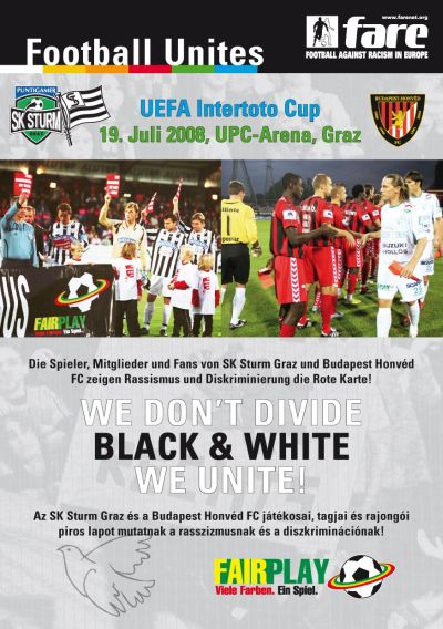 Die Teamkapitäne tragen bei allen Spielen der EURO 2008 Kapitänsbinden mit der Botschaft „Unite Against Racism“ (Vereint gegen Rassismus). An den Eingängen erhalten die BesucherInnen ein von beiden Vereinen gestaltetes zweisprachiges Flugblatt, im Stadion werden Poster mit dem Slogan „We don’t divide Black and White – We unite!“ und spezielle Transparente aufgehängt.